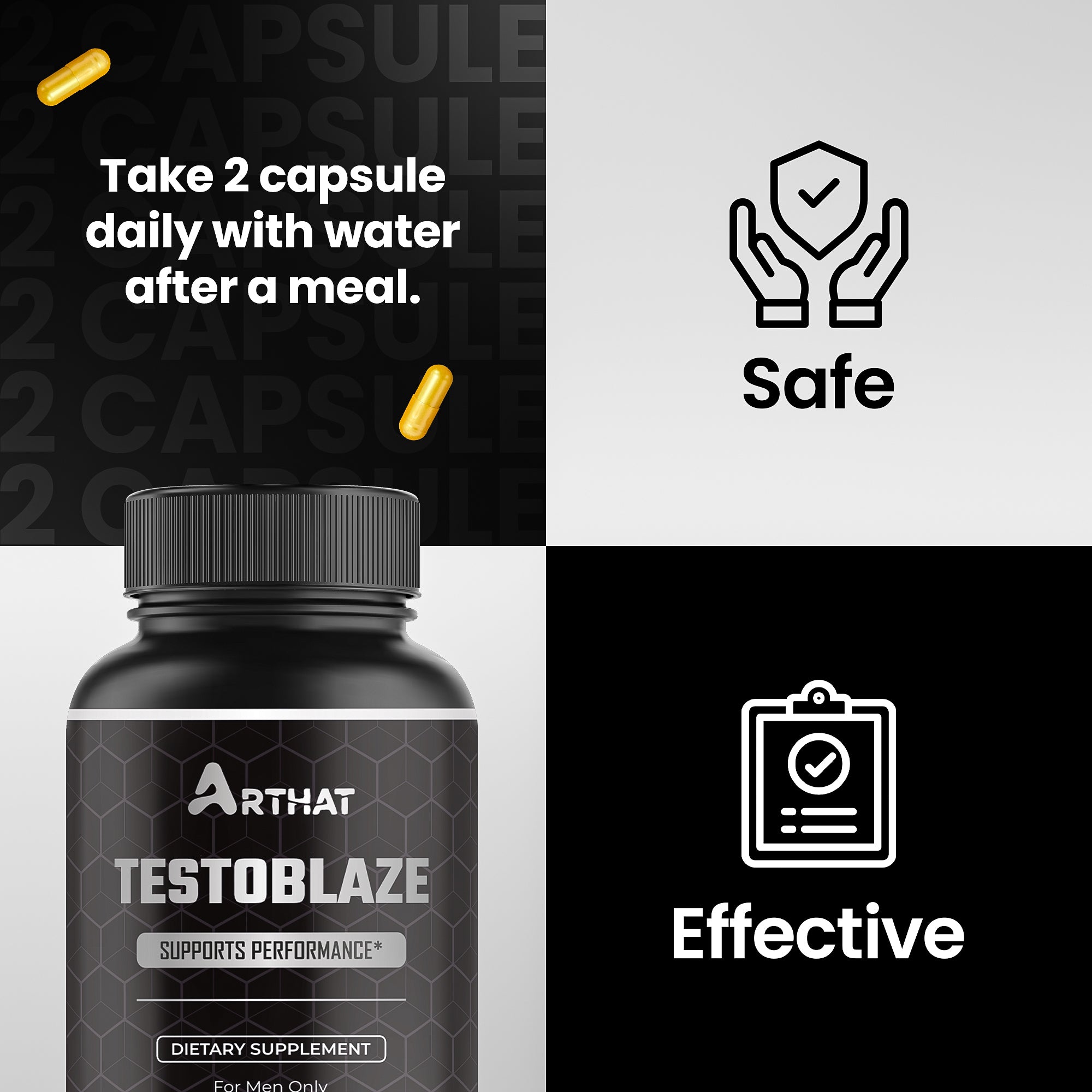 Arthat Testobooster is a vegetarian capsule, easy to consume, and designed for daily use as part of a healthy lifestyle.